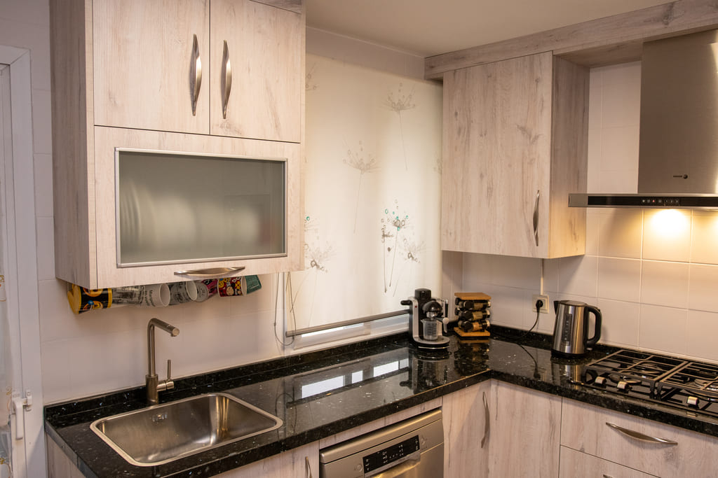 Fregadero bajo encimera y grifería negra mate.