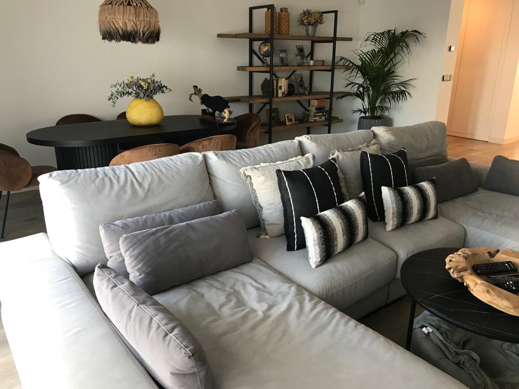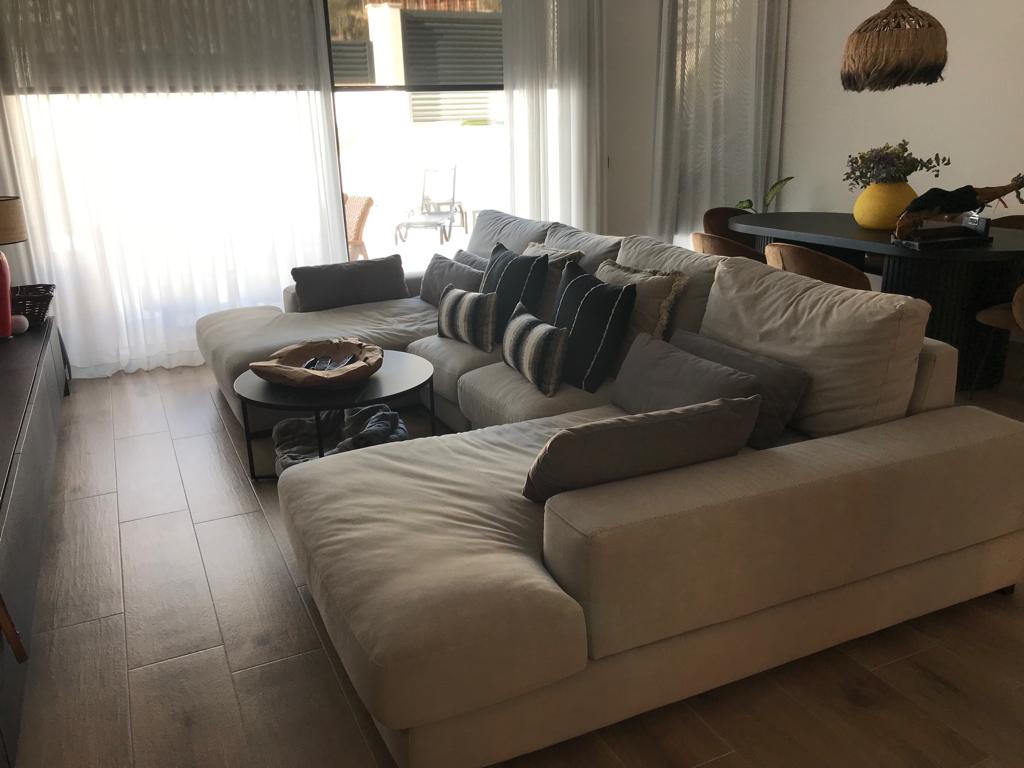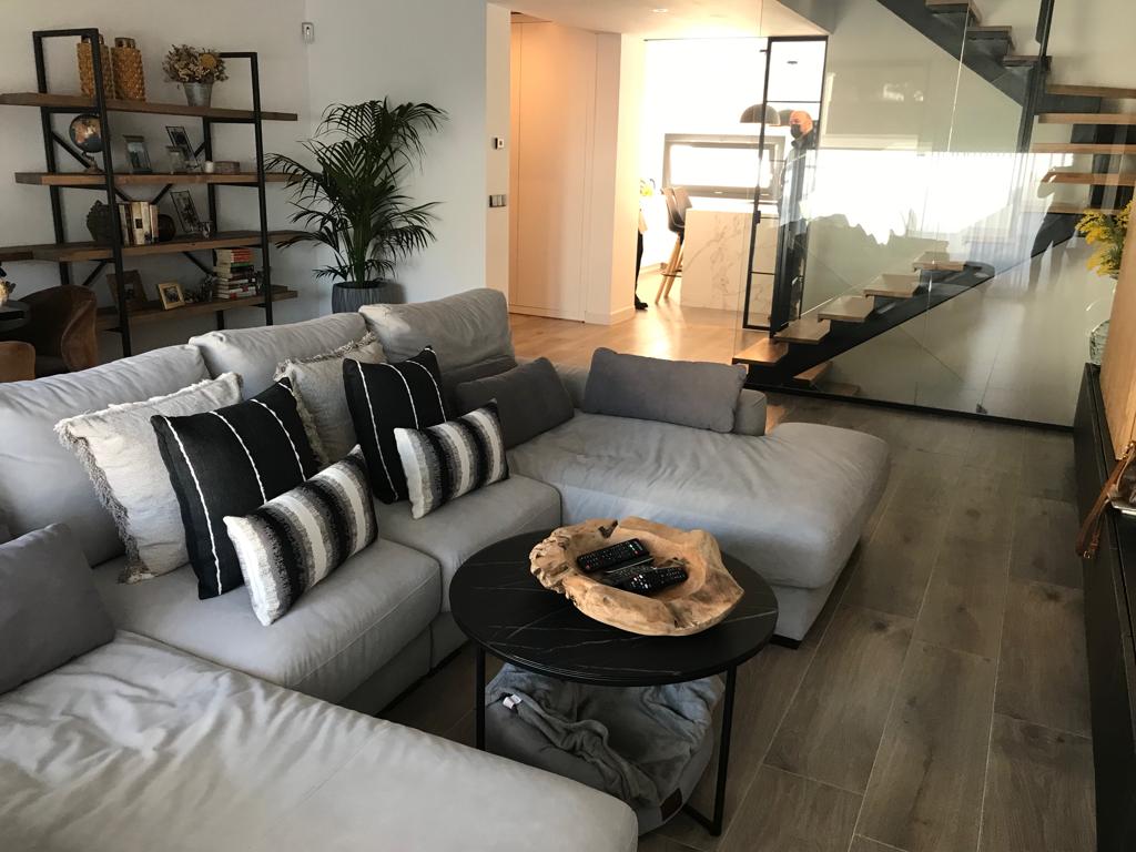 Revestimiento con panel porcelánico efecto cemento: resistente a manchas y calor, fácil de limpiar y sin juntas visibles.