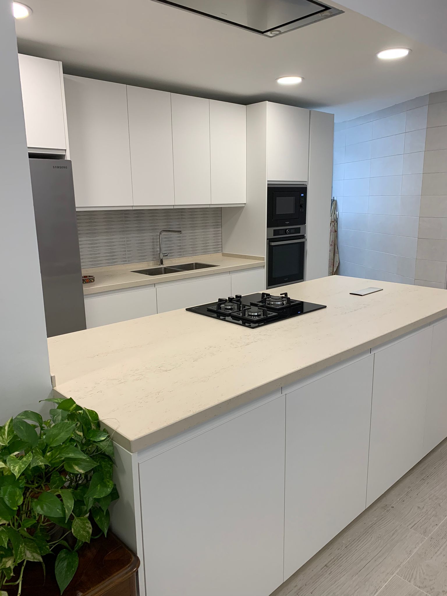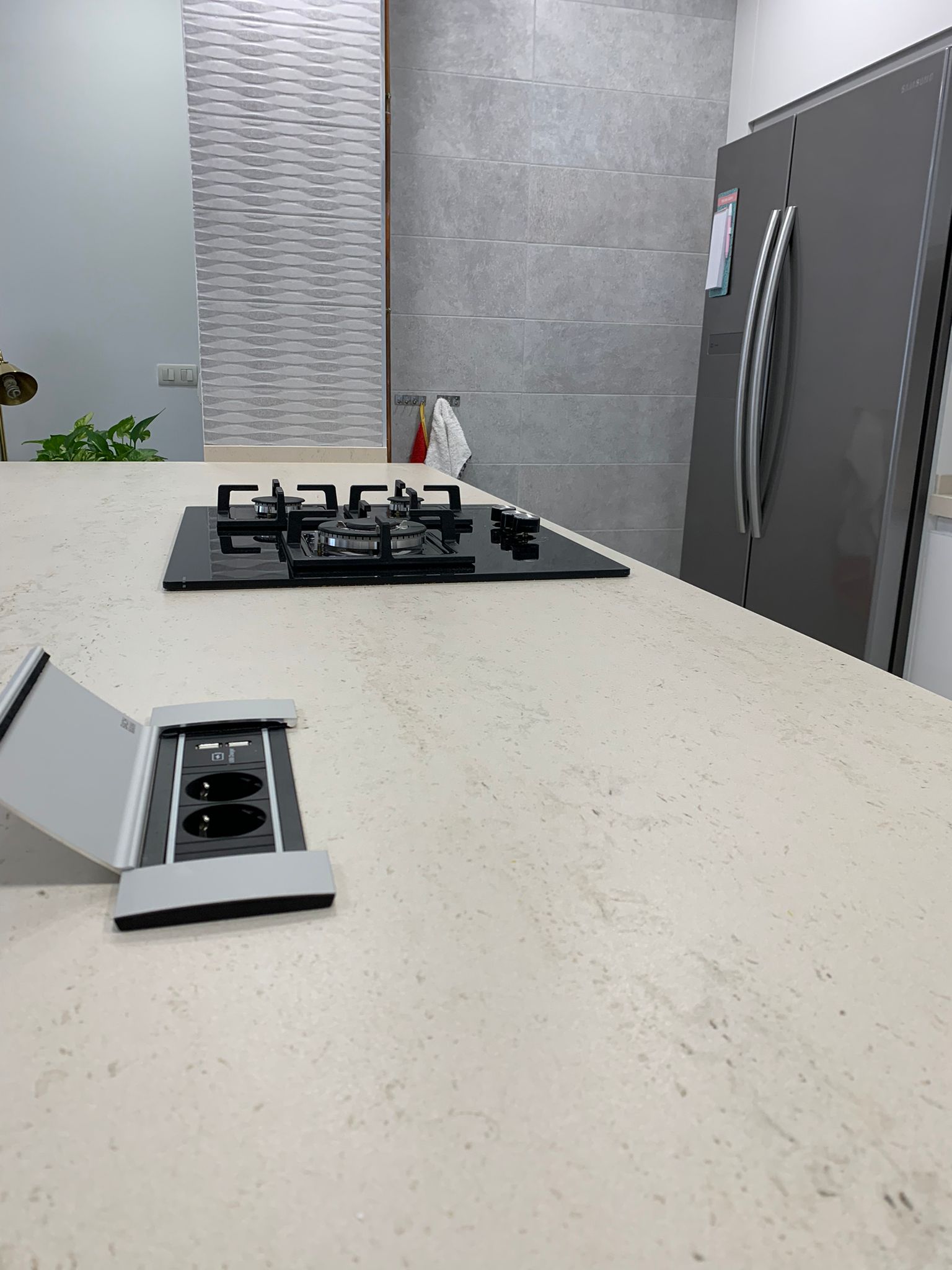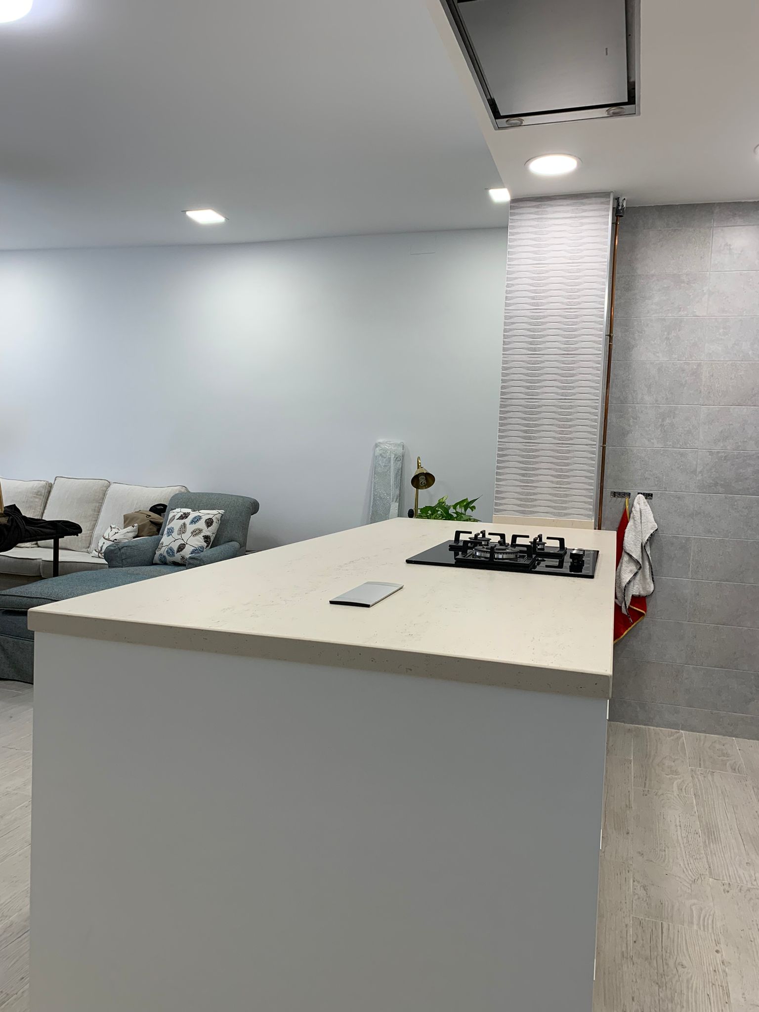 Revestimiento con panel porcelánico efecto cemento: resistente a manchas y calor, fácil de limpiar y sin juntas visibles.
