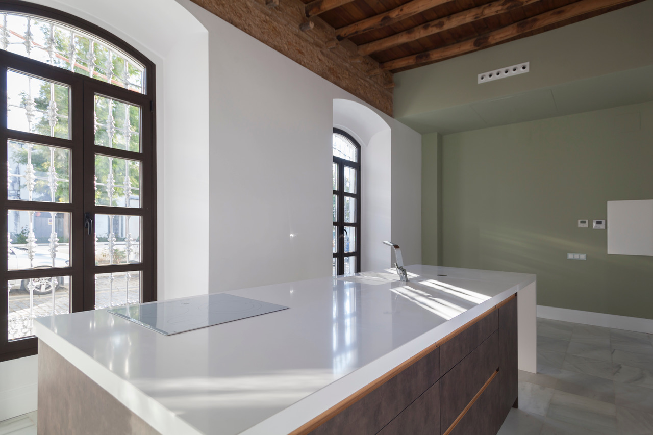 Revestimiento con panel porcelánico efecto cemento: resistente a manchas y calor, fácil de limpiar y sin juntas visibles.