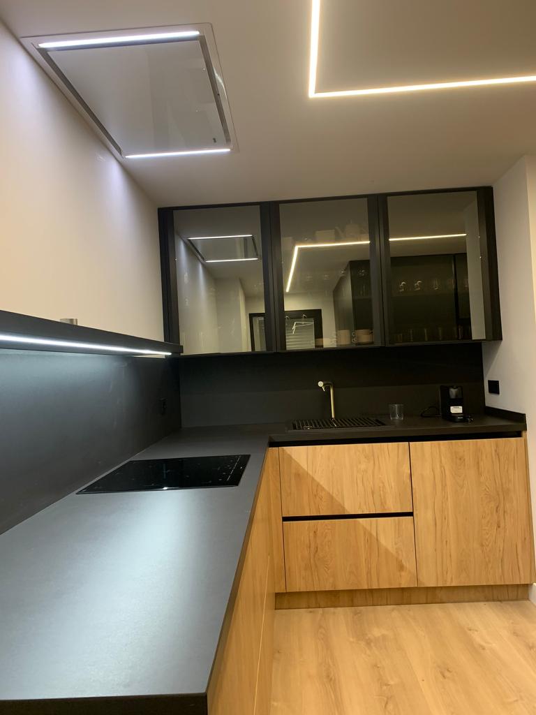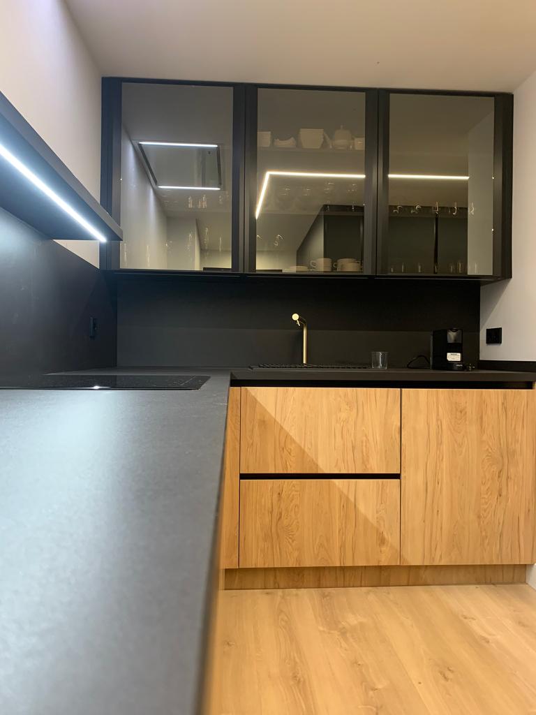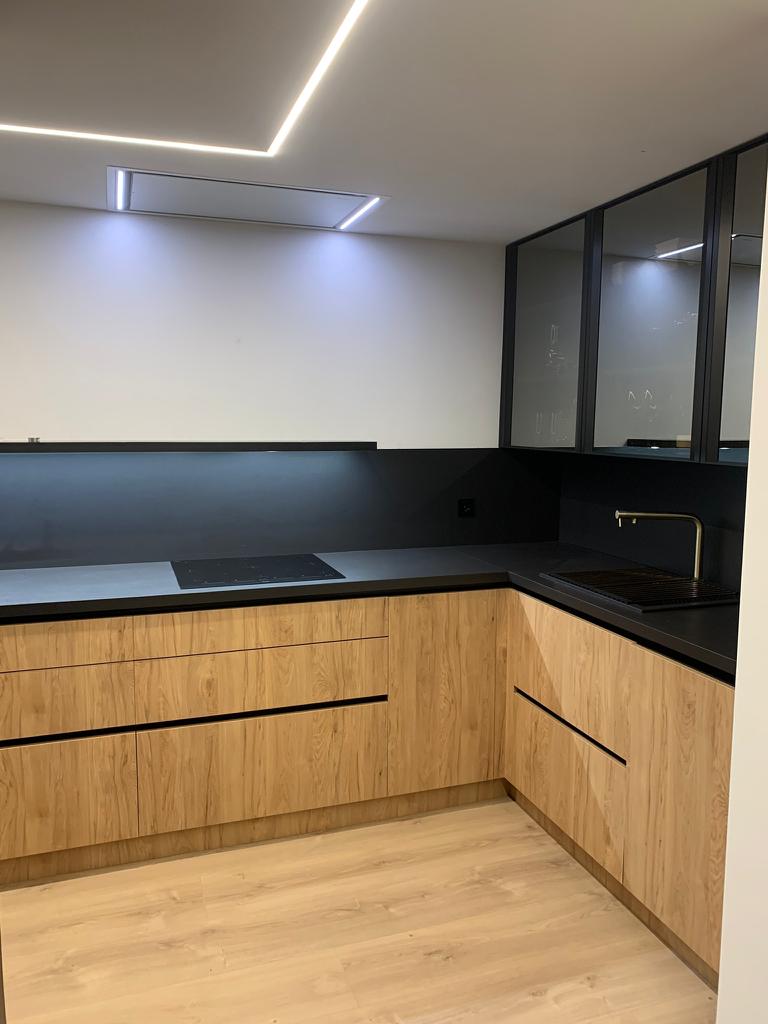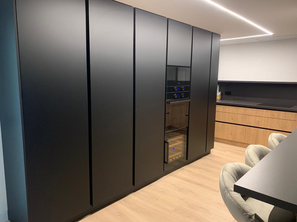 Revestimiento con panel porcelánico efecto cemento: resistente a manchas y calor, fácil de limpiar y sin juntas visibles.