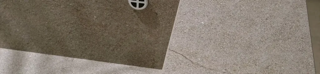 Revestimiento con panel porcelánico efecto cemento: resistente a manchas y calor, fácil de limpiar y sin juntas visibles.